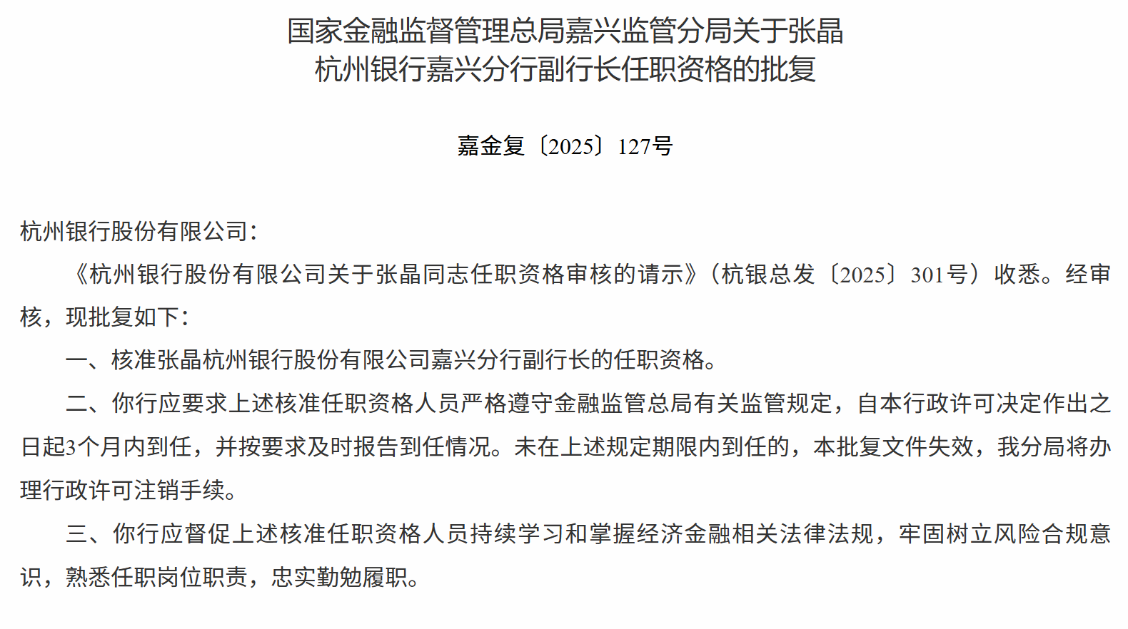 12月11日股票配资社区,国家金融监督管理总局嘉兴监管分局发布关于张晶杭州银行嘉兴分行副行长任职资格的批复,核准张晶杭州银行股份有限公司嘉兴分行副行长的任职资格。